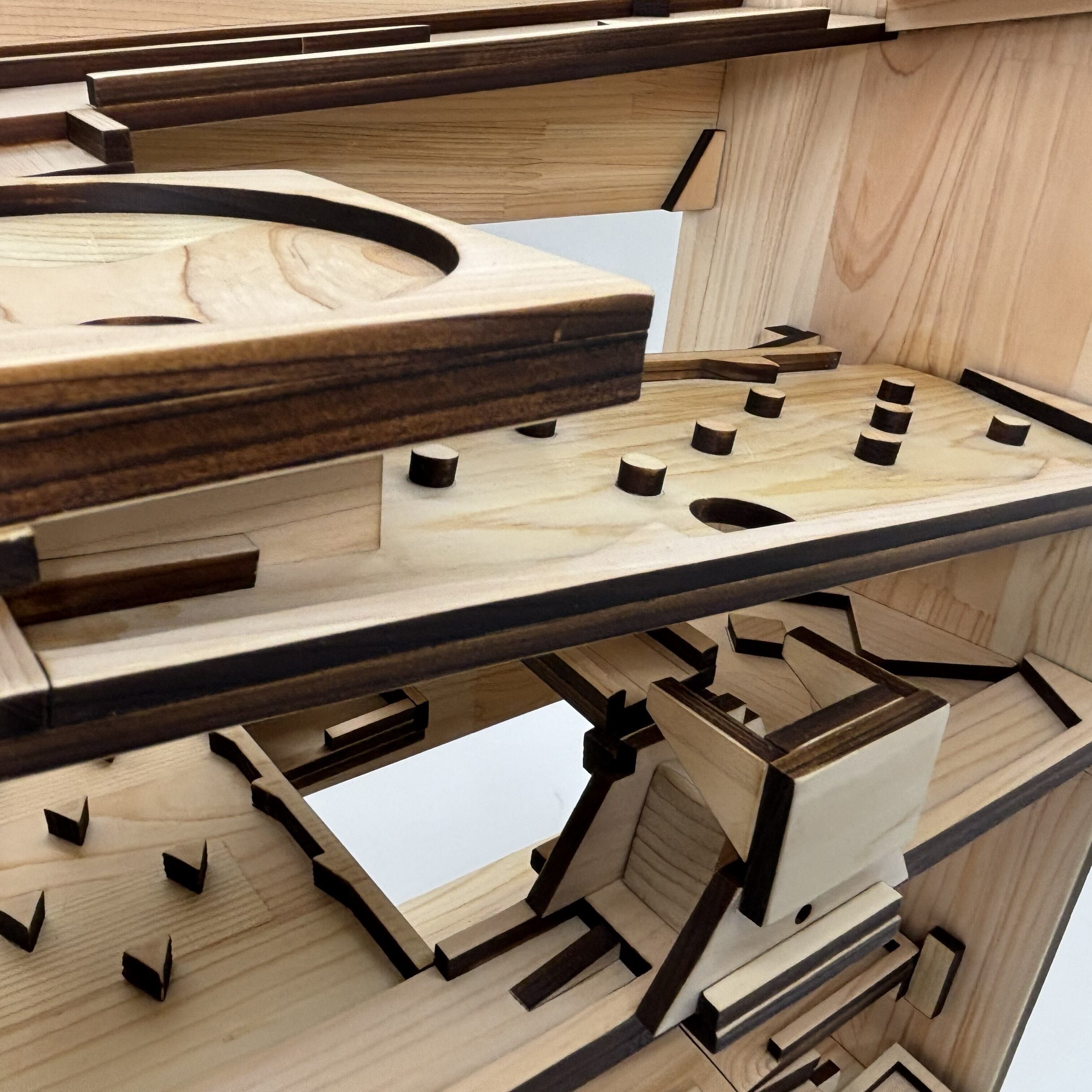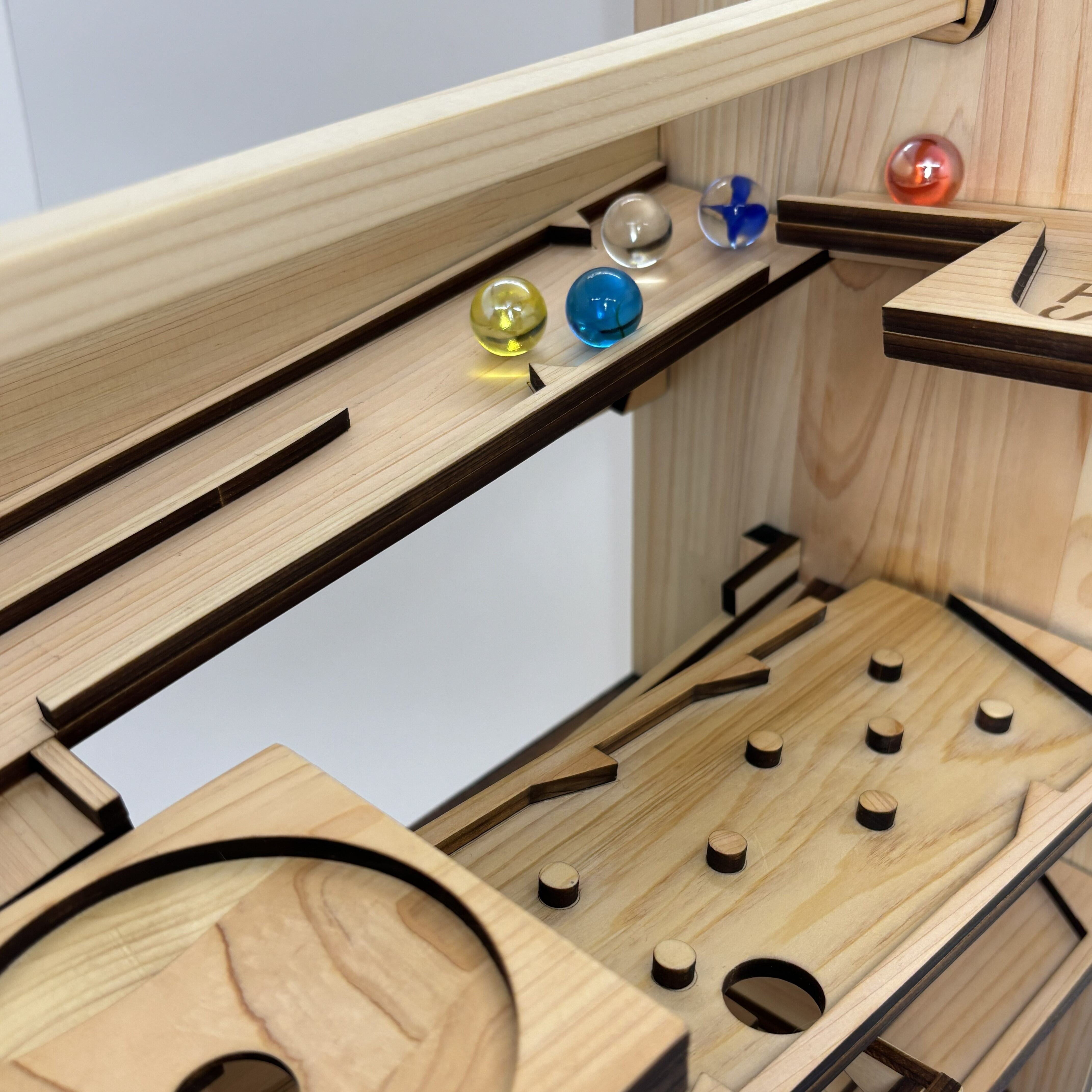 細部の仕上げや手作り感には個体差があります(木材の特性です)。隙間やムラ、切断面の粗さなどが見受けられる場合もございますが、ご了承ください。これらはビー玉滑走に影響を及ぼすものではありません。安全性だけはしっかり確認して送り届けます。時にはビー玉が止まることもありますが、そのドキドキ感までお楽しみいただけること間違いなし!